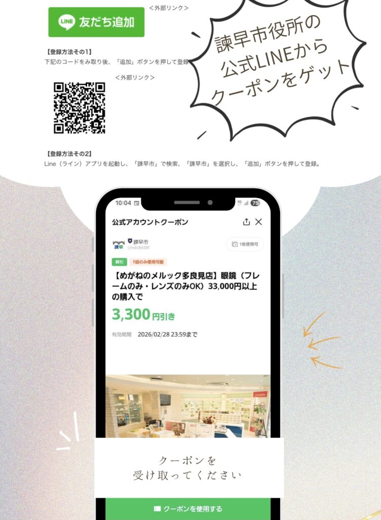 2026年2月10日 多良見店長崎県【店舗】こどもめがね【店舗】大人めがねスポーツアイガード大人めがね 多良見店限定、お得なクーポン 多良見店 TWEET SHARE POCKET FEEDLY LINE HATENA MAIL COPY LINK 諫早市公式LINEアカウントで、メルック多良見店限定の お得なクーポンがゲットできます! 2月末までの期間限定クーポンですよ♪ ぜひ諫早市役所LINEに登録してくださいね(^^)